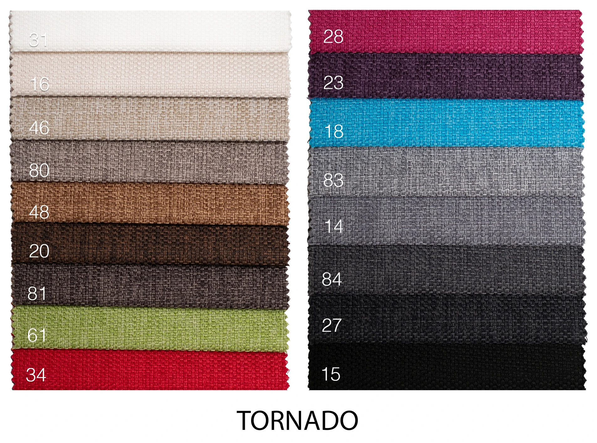 Tkaniny obiciowe z kolekcji Tornado to tkaniny bardzo miłe w dotyku, gładkie, drobnotkane z wyraźnie widocznym wzorem. Tkanina wyprodukowana w technologii ograniczającej wchłanianie cieczy, dzięki czemu tkanina jest plamoodporna. W przypadku rozlanej cieczy, jej krople gromadzą się na powierzchni tkaniny tworząc tzw. efekt rtęci. Zabrudzone miejsce wystarczy przetrzeć ściereczką,
